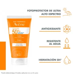 Protector solar SPF 50+ con color para pieles sensibles secas del rostro. Protege de los rayos UVA, UVB y Luz azul, aceleradora del envejecimiento cutáneo, hasta 450nm. Su textura aterciopelada hidrata el rostro hasta 8 horas dejando la piel nutrida y suave al tacto. La Crema SPF 50+ deja un acabado imperceptible y sin brillos en la piel cuando se aplica y es una excelente base para el maquillaje diario. La fórmula también es resistente al agua.