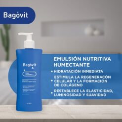 Emulsión hipoalergénica. La fluidez de su textura y su fórmula hidroemulsionada permiten una rápida penetración de la Vitamina A, favoreciendo una placentera y suave aplicación en todo el cuerpo. Restituye la firmeza, vitalidad y luminosidad de la piel.