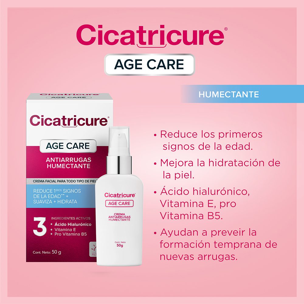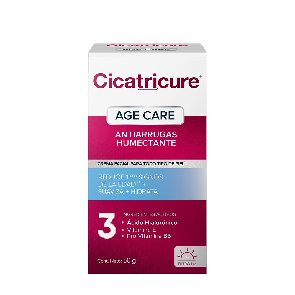 Cicatricure Age Care Humectante con Acido Hialurónico reduce la profundidad de las primeras arrugas y mejora la hidratación de la piel. Ademas contiene filtros UV que ayudan a prevenir la formación temprana de nuevas arrugas. Textura ligera y de rápida absorción.
