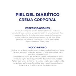 La crema corporal piel del diabético tiene una exclusiva formulación que contiene una combinación de Urea, Aceite de Rosa Mosqueta, Castaño de indias y componentes antiglicantes que otorgan máxima hidratación y suavidad a la piel sana de las personas con diabetes, disminuyendo así la resequedad especialmente en codos y pies.