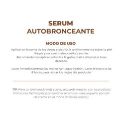 Se recomienda aplicar el serum autobronceante con la yema de los dedos sobre la piel limpia y seca del rostro, cuello y escote. Utilizar entre 8 y 12 gotas, según la intensidad deseada. Para un resultado más suave, mezclar el serum con la crema hidratante Dermaglós directamente en la mano antes de aplicarlo. Retirar del rostro a las 8 horas para mantener un color uniforme y natural.