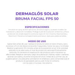 El Protector Solar Facial Dermaglós FPS 50 en Bruma Spray ofrece una protección avanzada de amplio espectro contra los rayos UVA y UVB, con una fórmula liviana, matificante y de rápida absorción. Enriquecido con glicerina, niacinamida y vitamina E, hidrata sin dejar sensación oleosa, ayuda a prevenir manchas, arrugas y el envejecimiento prematuro, y es ideal para uso diario en pieles sensibles. Con textura invisible y aplicación práctica en spray, este protector es hipoalergénico, no comedogénico, dermatológica y oftalmológicamente testeado, libre de TACC, no testeado en animales y respetuoso con los océanos.