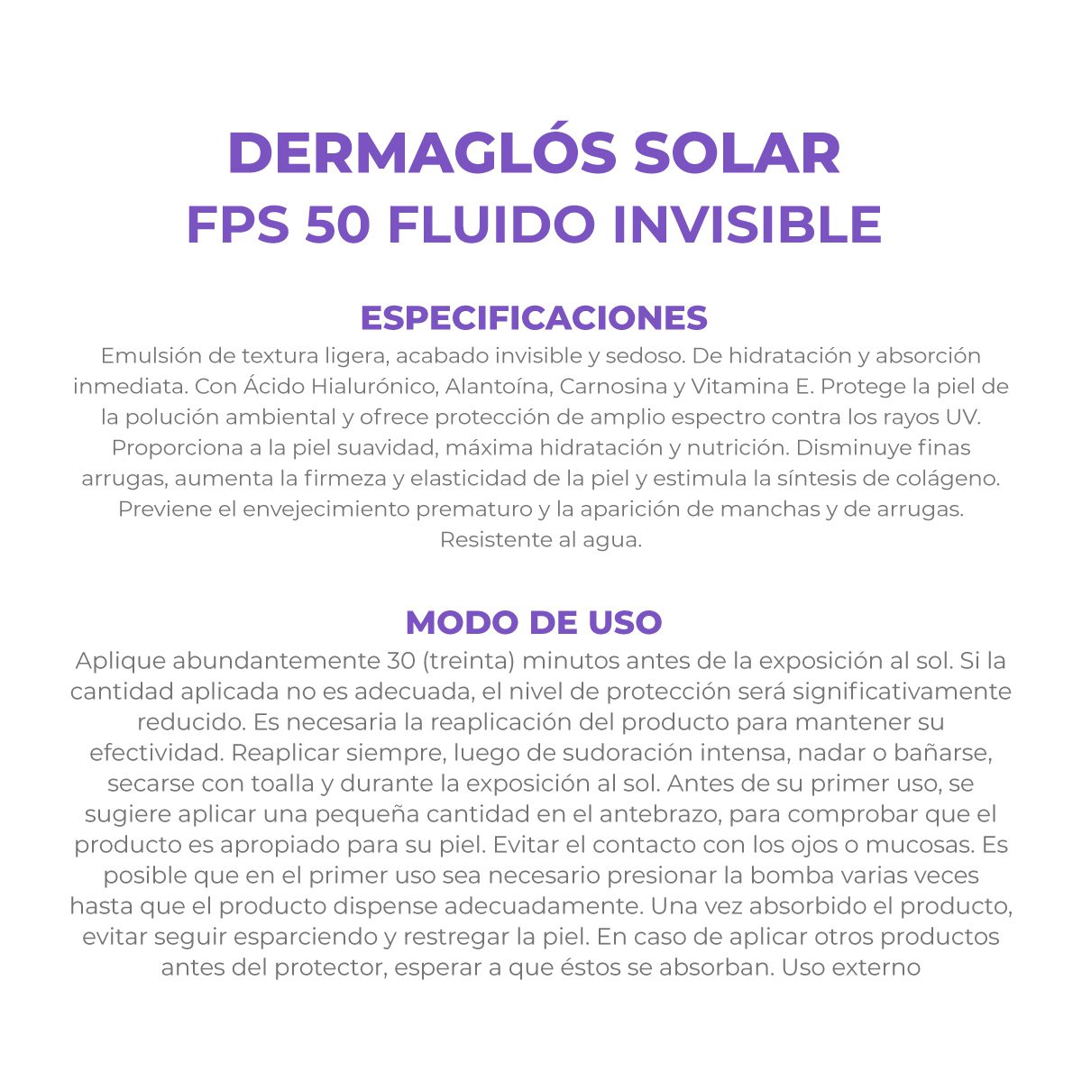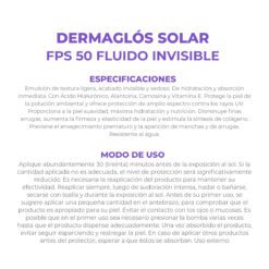 El Protector Solar Facial Dermaglós FPS 50 Emulsión Fluida brinda una protección solar de amplio espectro contra los rayos UVA y UVB, mientras hidrata profundamente y mejora visiblemente la calidad de la piel. Su fórmula de textura liviana, acabado invisible y sedoso, es de rápida absorción y enriquecida con ácido hialurónico, alantoína, carnosina y vitamina E, activos que nutren, reparan y ayudan a prevenir el envejecimiento prematuro de la piel. Además de su acción antiedad, protege la piel de la polución ambiental y está formulado para todo tipo de piel, incluso pieles sensibles. Es resistente al agua, dermatológicamente testeado y ideal para el uso diario en climas urbanos o al aire libre.