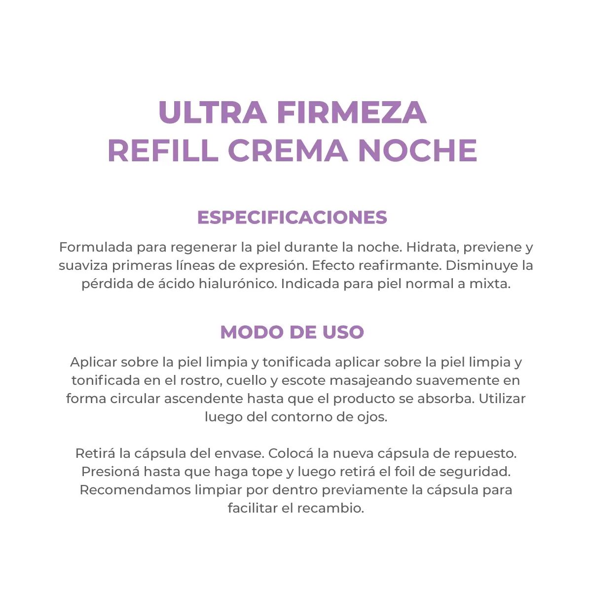 Su formato en cápsula de repuesto es ideal para reducir residuos y continuar con tu rutina sin interrupciones. Dermatológicamente testeada, hipoalergénica y libre de parabenos, esta crema nocturna es perfecta para cuidar la piel sensible sin irritaciones.