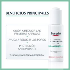 Combate los primeros signos de envejecimiento y afina los poros con el nuevo serum refinador de la piel Hyaluron-Filler de Eucerin. Este serum ultraligero contiene tres activos clave, como el Ácido Hialurónico, el Ácido Glicólico y el Ácido Láctico, que dejan la piel sedosa. Su fórmula con antioxidantes también protege la piel contra los radicales libres y los daños causados por los agresores ambientales.