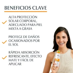 Protector solar en spray transparente y desarrollado específicamente para la piel corporal sensible. Una protección efectiva para los daños de la piel inducidos por el sol gracias a su sistema de filtro UVA/UVB fotoestable. Indicado en pieles grasas.