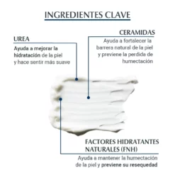 La fórmula contiene Urea, Ceramida así como otros Factores Naturales de Hidratación (NMFs) que fijan la humectación y reparan la barrera cutánea protectora natural para evitar mayores pérdidas de hidratación.