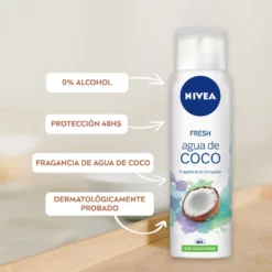 El desodorante antitranspirante femenino NIVEA Agua de Coco en aerosol brinda una máxima protección durante 48 horas, dejando una sensación de piel limpia y seca. Su innovadora fórmula contiene Agua de Coco, un ingrediente que otorga una frescura duradera. Su presentación sin siliconas es adecuada para todo tipo de pieles.