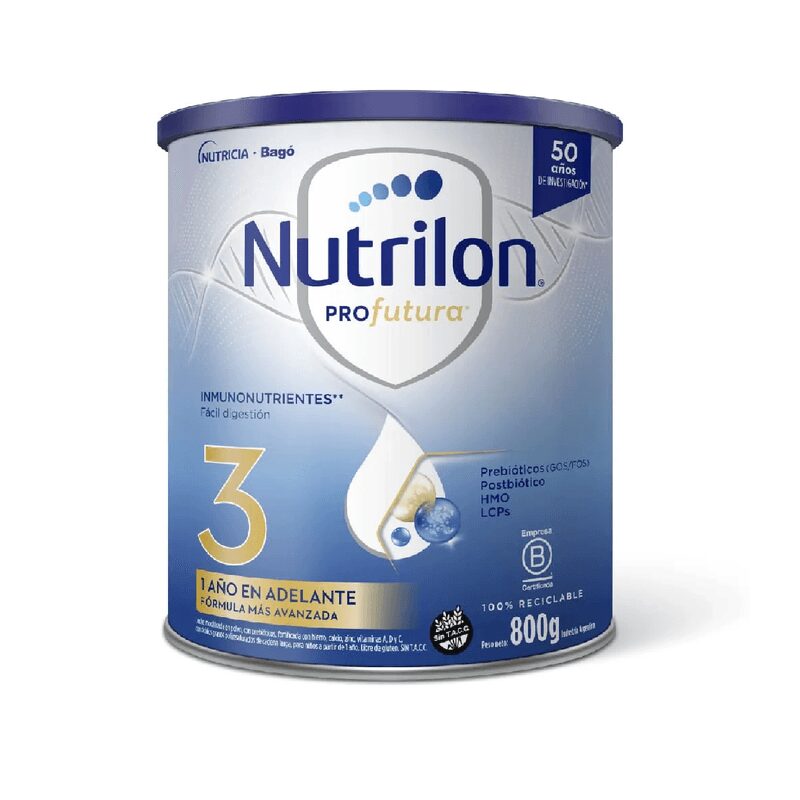 Nutrilon Profutura 3 1 Lata x 800gr Leche modificada en polvo, adicionada con GOS y FOS *, fortificada con hierro, calcio, zinc, vitaminas A, D y C, con ácidos grasos poliinsaturados de cadena larga, para niños a partir de 1 año. Libre de gluten. SIN T.A.C.C. AHORA, NUEVA FÓRMULA. La nueva fórmula de Nutrilon Profutura 3: • Mezcla única patentada de GOS/FOS* actúa sobre el sistema inmune. • LCPs: DHA + EPA: ácidos grasos que actúan en el cerebro y el sistema inmune. • Contenido proteico adaptado a las necesidades del niño. * Galacto-oligosacáridos y Fructo-oligosacáridos. AVISO IMPORTANTE: La leche materna es la mejor alimentación para tu hijo. Cuando ésta no es posible o es insuficiente, el pediatra es quién mejor puede aconsejar el tipo de alimento a brindar. Instrucciones de apertura de la lata: Nuestro envase ha sido diseñado especialmente para hacer la preparación de la fórmula infantil más fácil y segura. 1. Remueva el precinto de seguridad colocando dos dedos por detrás del precinto y tirando hacia abajo. 2. Abra la lata. 3. Desprenda la cuchara medidora y colóquela en el soporte de la tapa. 4. Remueva totalmente la lámina protectora y proceda a preparar la fórmula infantil siguiendo las Instrucciones de uso. 5. Guarde la cuchara en la tapa después de cada uso para un manejo más seguro. 6. Cierre la lata. INSTRUCCIONES PARA SU USO Cumpla cuidadosamente las instrucciones para la preparación de Nutrilon Profutura 3. Evite la contaminación durante la apertura, manipulación y uso. No seguir las instrucciones puede significar un riesgo para la salud del bebé. Se recomienda que todas las ingestas sean preparadas en el momento de consumirlas 1. Lávese las manos y limpie todos los elementos a utilizar para la preparación. 2. Esterilice el biberón y la tetina hirviéndolos en agua potable durante 10 minutos. 3. Hierva agua potable durante 5 minutos; déjela enfriar. Para la preparación de 200 ml, incorpore a 180 ml de agua hervida (tibia o fría) 6 medidas al ras de Nutrilon Profutura 3 en polvo. 4. Añada Nutrilon Profutura 3 en polvo; utilice como medida la cuchara suministrada al ras, nivelando el polvo con un cuchillo limpio, sin presionar. Conserve la cuchara limpia y seca dentro de la lata. 5. Cierre el biberón o vaso y agite hasta que el polvo esté completamente disuelto. Verifique la temperatura del alimento y utilícelo durante la primera hora de preparado. 6. Lave el biberón y la tetina después de usados, desechando los sobrantes de leche no utilizados. No usar microondas, esto puede causar severas quemaduras. Utilice el producto únicamente si el peel off / lamina de aluminio se encuentra en buenas condiciones ALMACENAMIENTO: una vez abierto el envase, consuma el producto en un plazo máximo de 3 semanas. Mantenga el envase bien cerrado en lugar fresco y seco: descartar el envase una vez consumido el producto, no reutilizar. Producto envasado bajo atmósfera inerte.