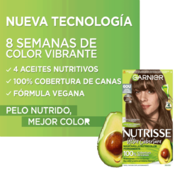 Coloración Permanente de Garnier Nutrisse Ultra Cobertura, diseñada para proporcionar la mejor nutrición al cabello, junto con un color intenso. Con su Tecnología Ultra Cobertura, posee un concentrado de pigmentos para un color profundo y una cobertura duradera especial para esas canas rebeldes.
