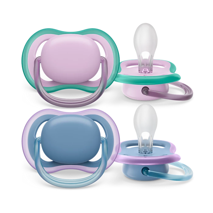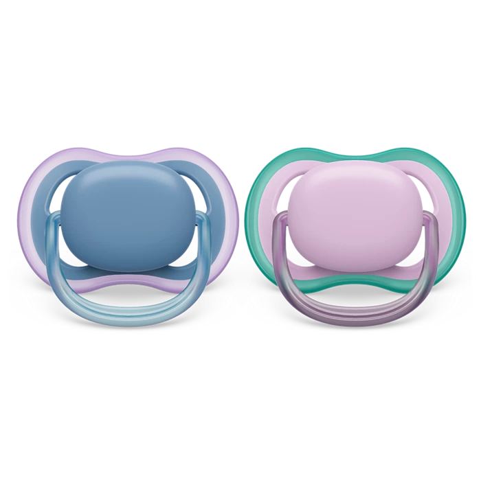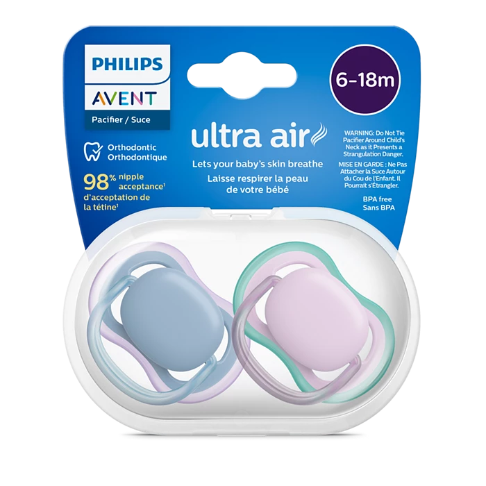 Calma con la comodidad del aire. El chupete Philips Avent ultra air cuenta con orificios de ventilación extragrandes para mantener la piel del bebé seca. Disponible en varios colores y diseños.