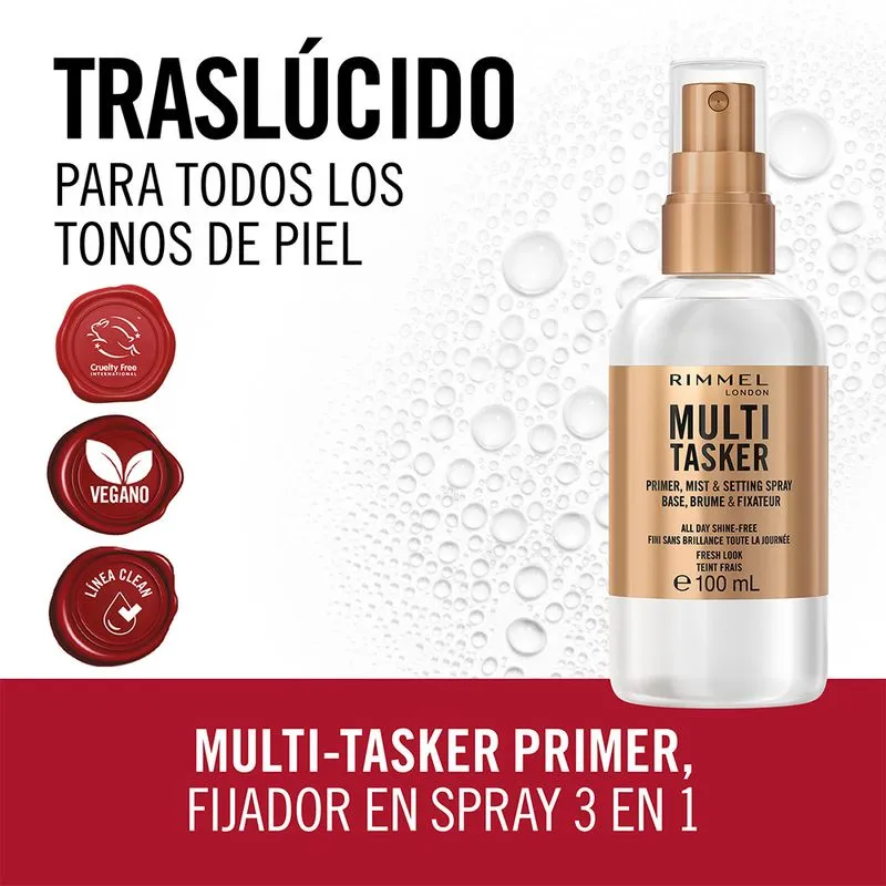 Spray Primer, Fijador y Bruma Rimmel Multitasker 3 En 1 x 100 ml Multi-Tasker Primer, Mist & Setting Spray 3 en 1. Prepara tu cutis, refresca tu piel y tiene poder fijador durante todo el día. Una bruma para el rostro que deja la piel revitalizada al instante. Para un look fresco que deja la piel libre de brillos durante todo el día.