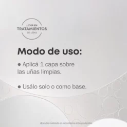 Aplicá 1 fina lámina sobre las uñas limpias. Usalo sólo o como capa base.