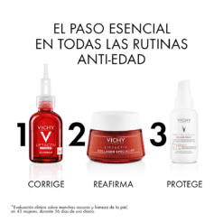 Con péptidos antiedad y Vitamina B3 (Niacinamida) para ayudar a prevenir arrugas y manchas. Además, gracias a la acción sinérgica del Agua Volcánica de Vichy, y junto a las Fracciones Probióticas, protege la función barrera de la piel.